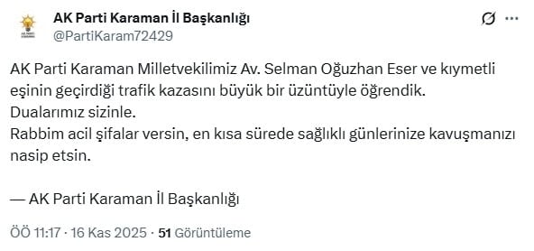 Eser’in kaza haberinin ardından AKP Karaman İl Başkanlığı, geçmiş olsun mesajı paylaştı.