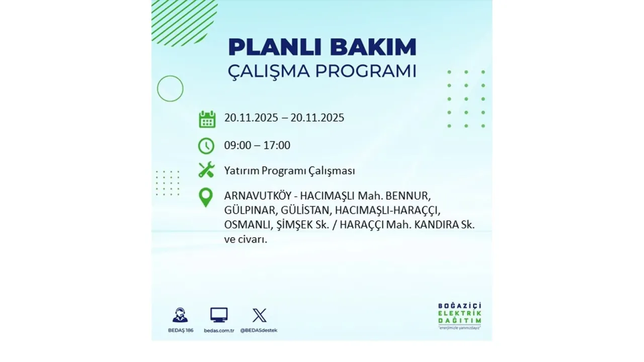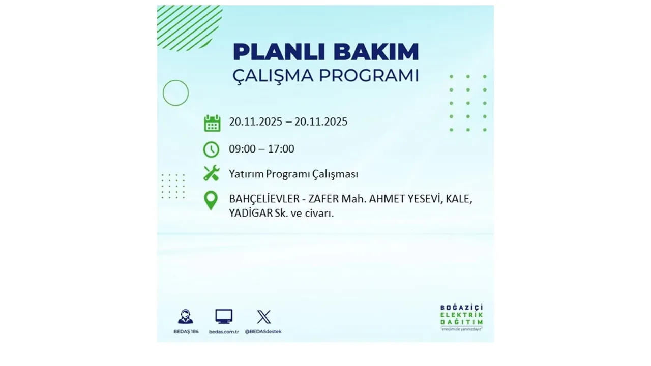 Yarın da (20 Kasım) İstanbul’un bir çok ilçesinde ve mahallesinde planlı kesintiler meydana gelecek. İşte o ilçe ve mahalleler:
