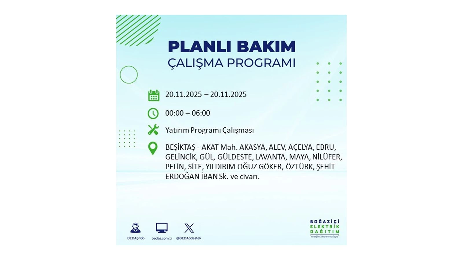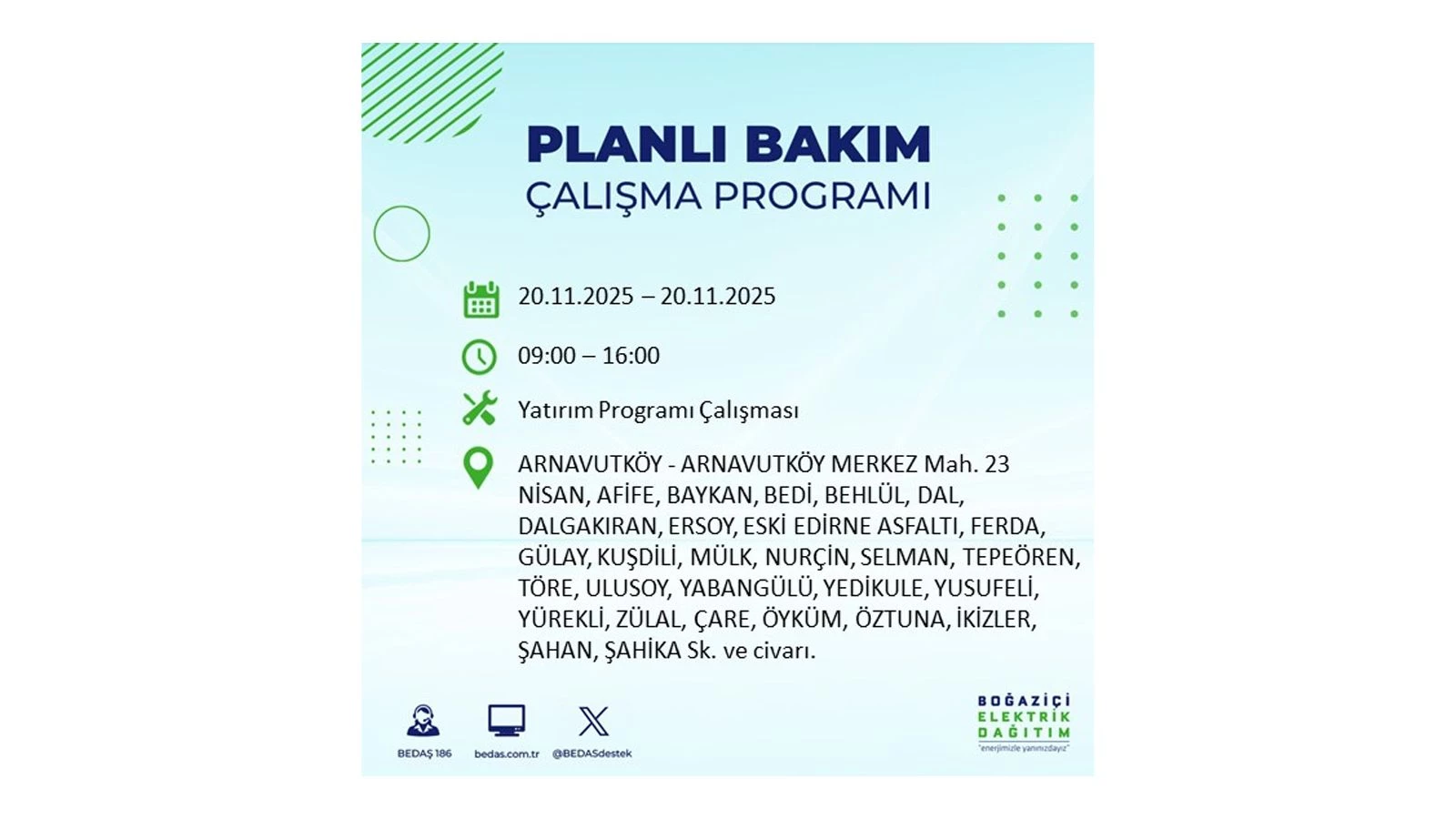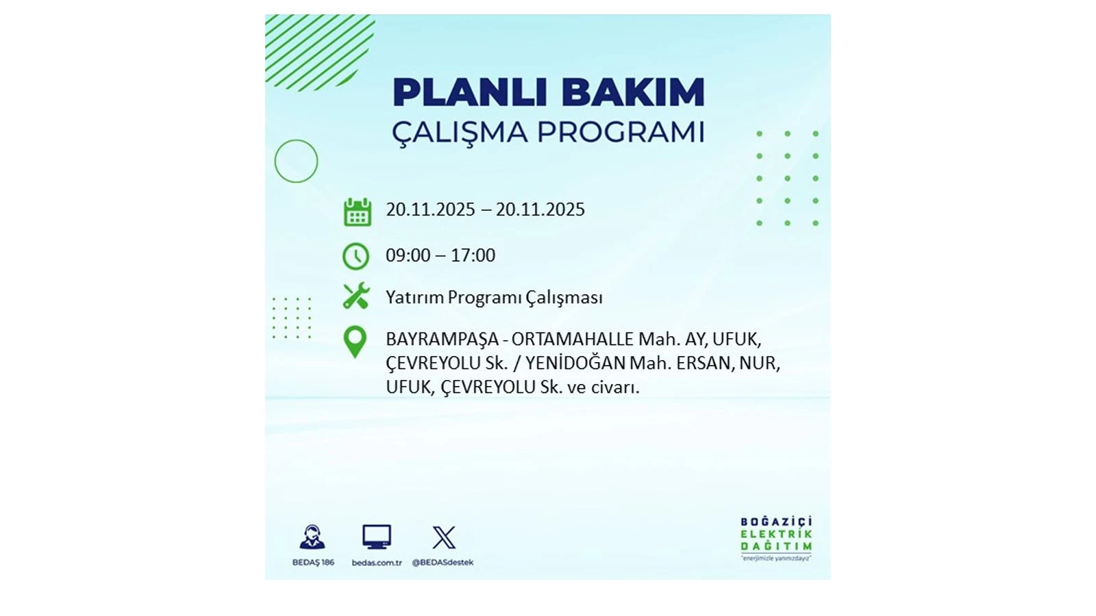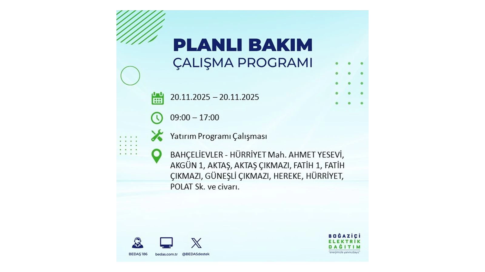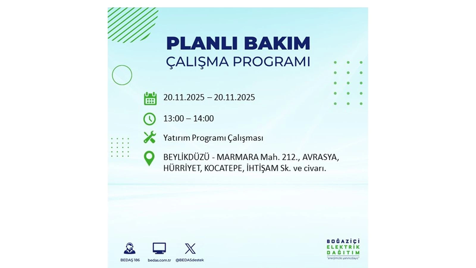 Vatandaşlar, “www.bedas.com.tr” adresinde bulunan “Planlı Kesintiler” sekmesinden, cep telefonlarına indirilen mobil uygulama üzerinden ya da 186 BEDAŞ mobil hattını arayarak planlanan elektrik kesintilerine ait güncel bilgilere ulaşabiliyor.