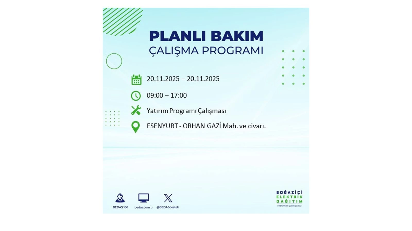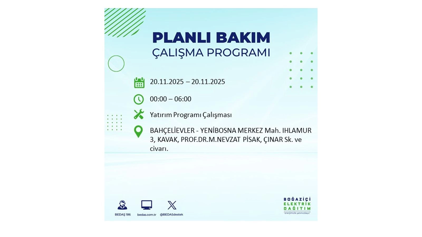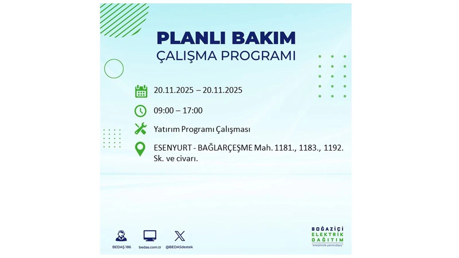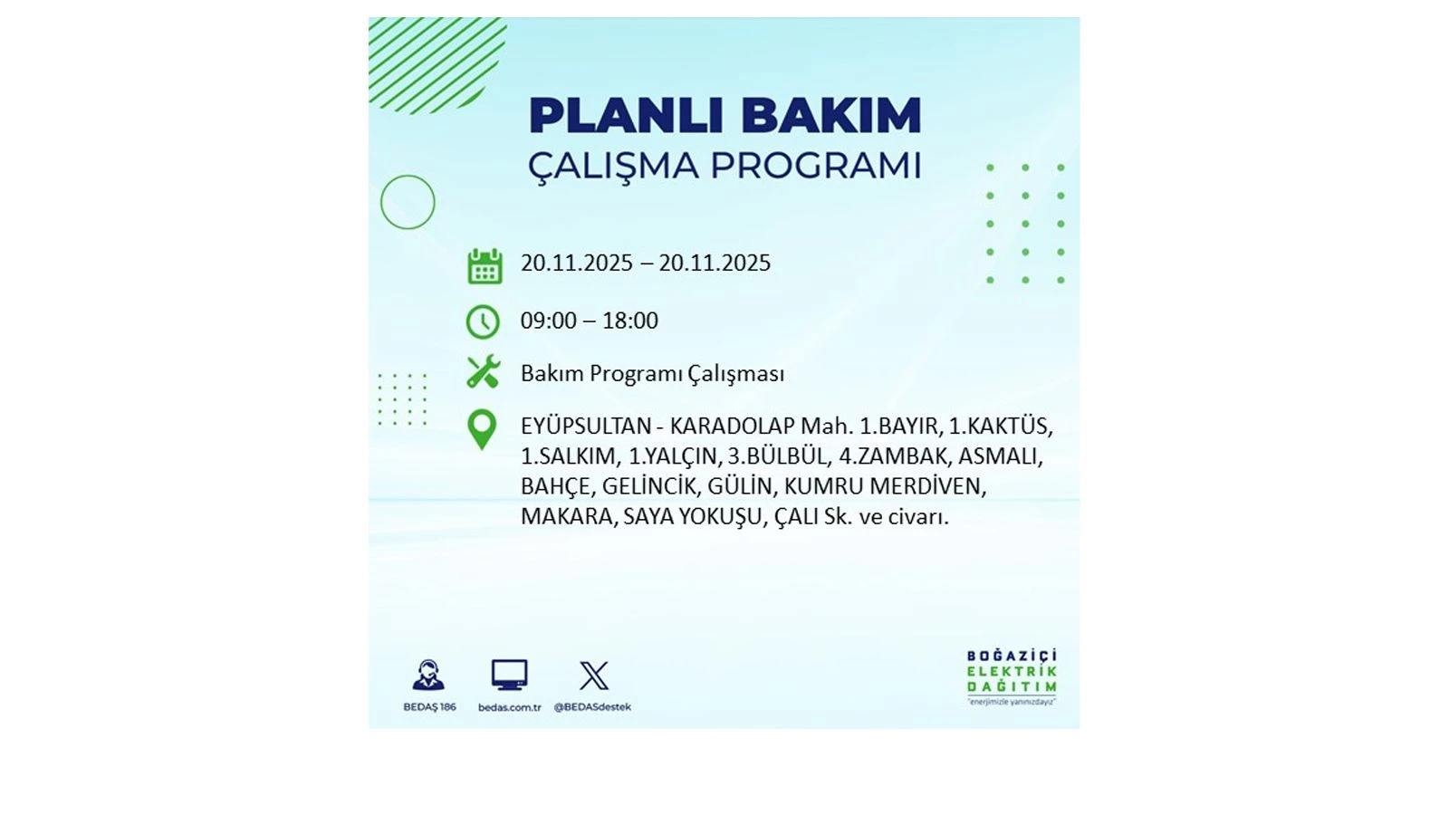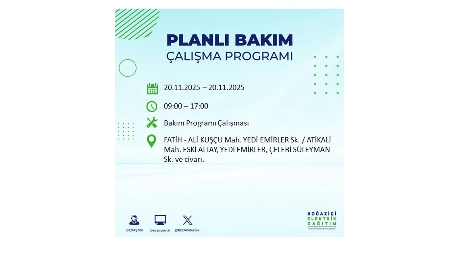 Vatandaşlar, “www.bedas.com.tr” adresinde bulunan “Planlı Kesintiler” sekmesinden, cep telefonlarına indirilen mobil uygulama üzerinden ya da 186 BEDAŞ mobil hattını arayarak planlanan elektrik kesintilerine ait güncel bilgilere ulaşabiliyor.