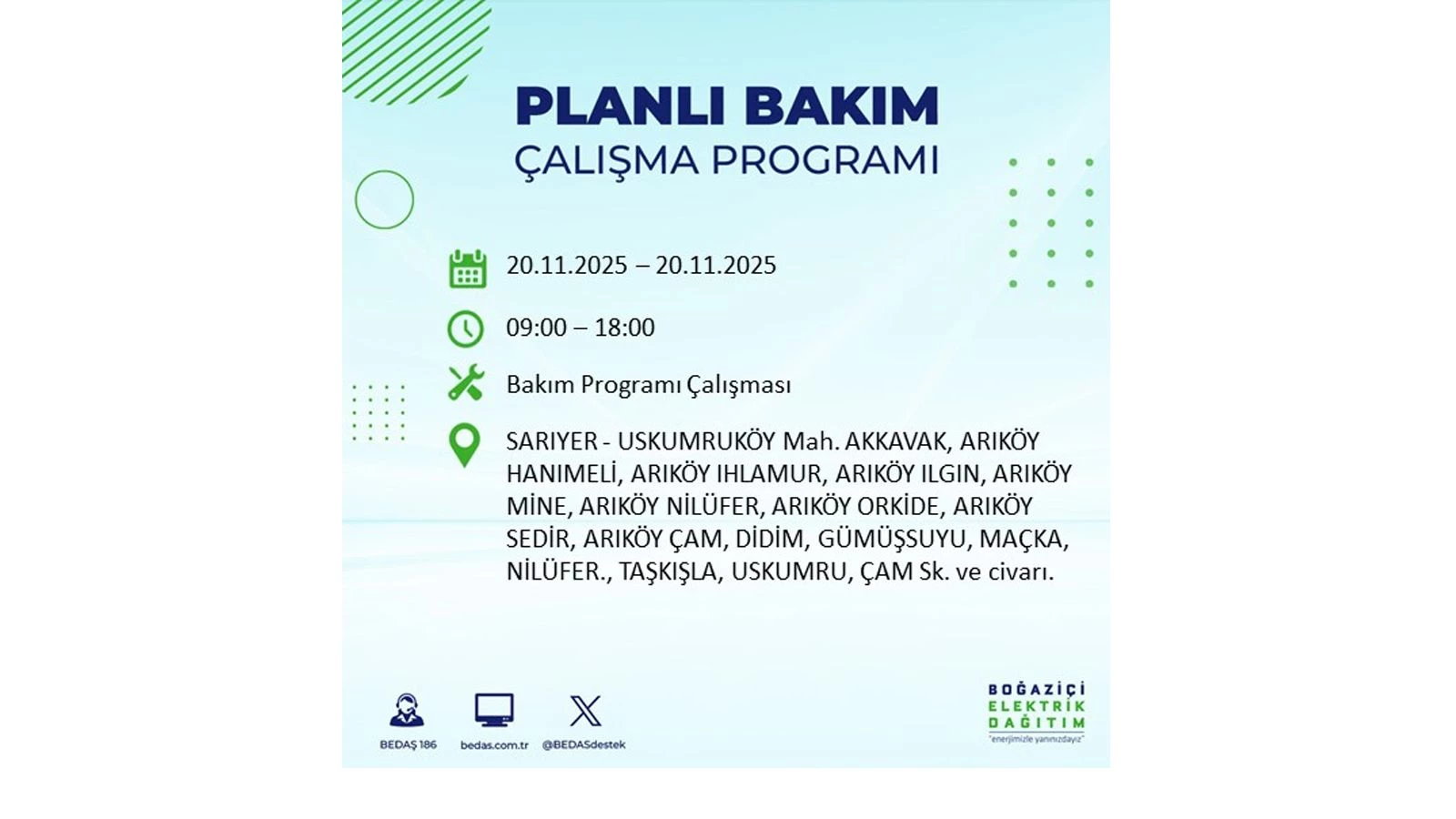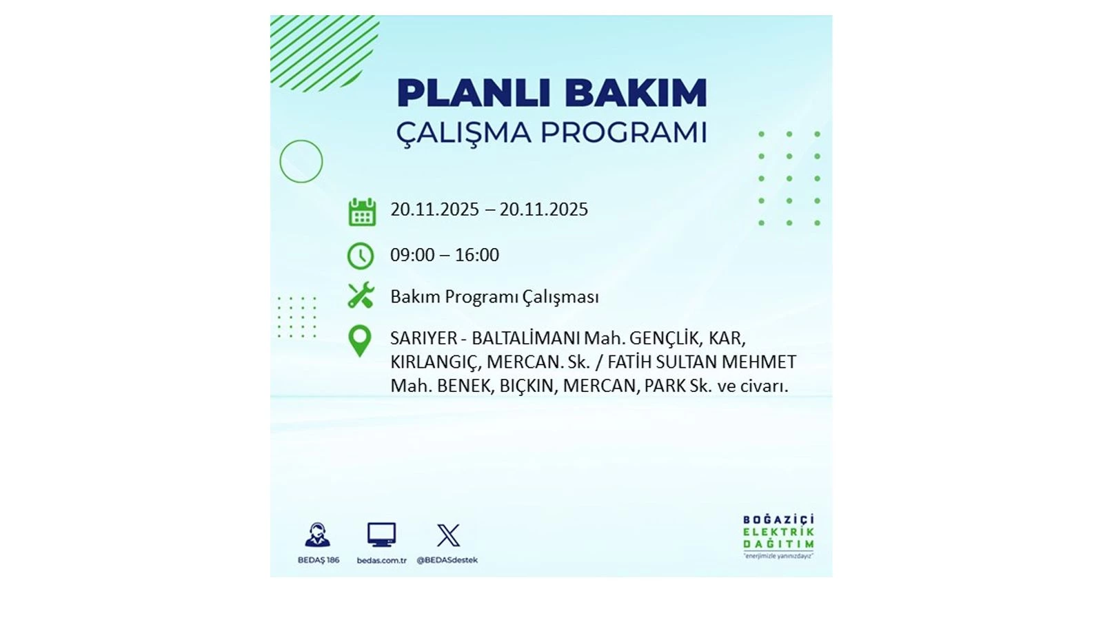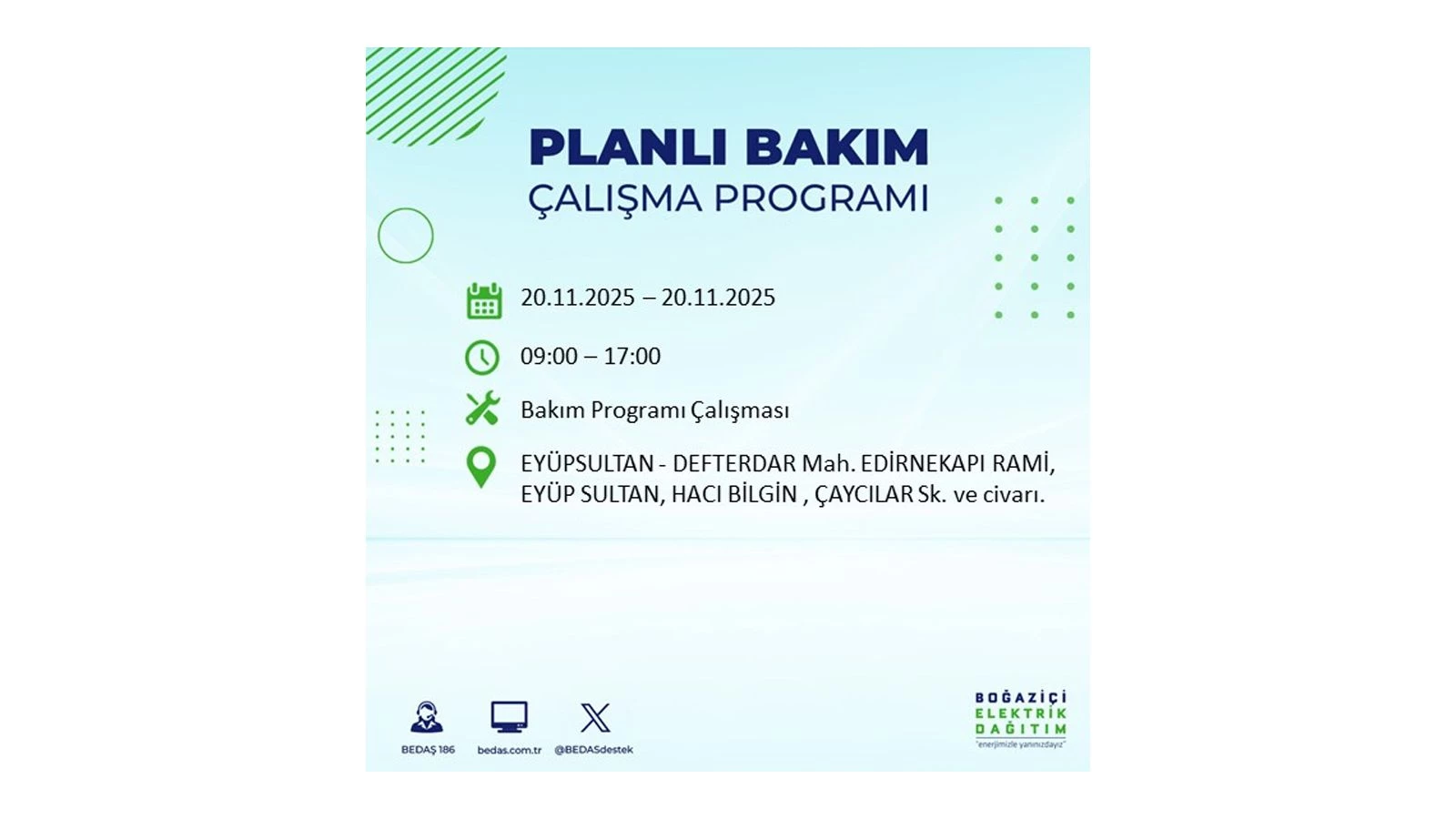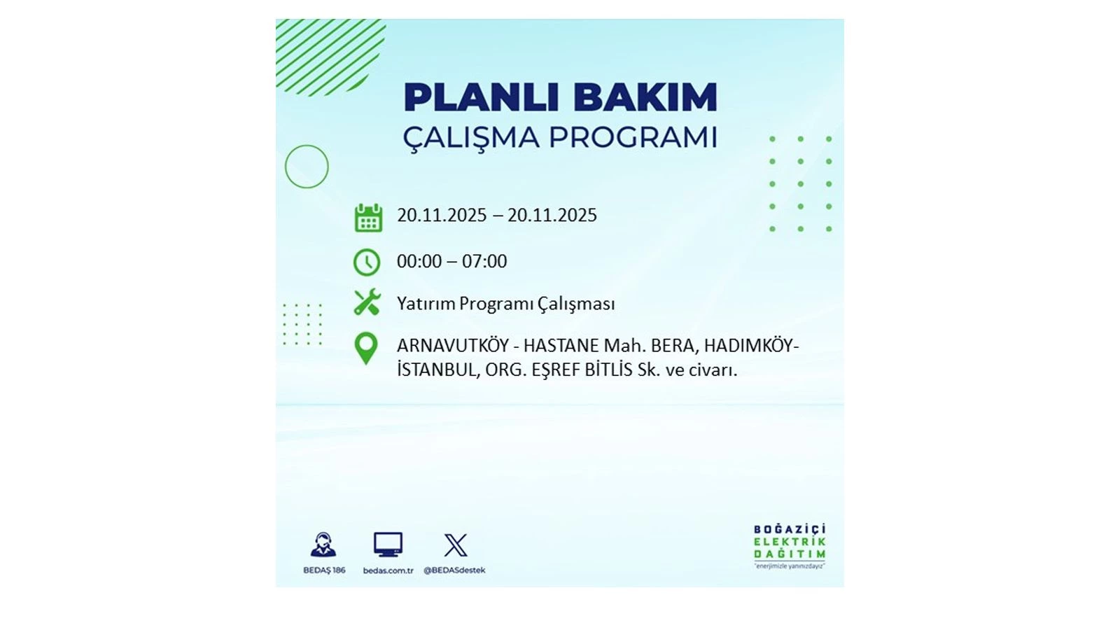 Vatandaşlar, “www.bedas.com.tr” adresinde bulunan “Planlı Kesintiler” sekmesinden, cep telefonlarına indirilen mobil uygulama üzerinden ya da 186 BEDAŞ mobil hattını arayarak planlanan elektrik kesintilerine ait güncel bilgilere ulaşabiliyor.