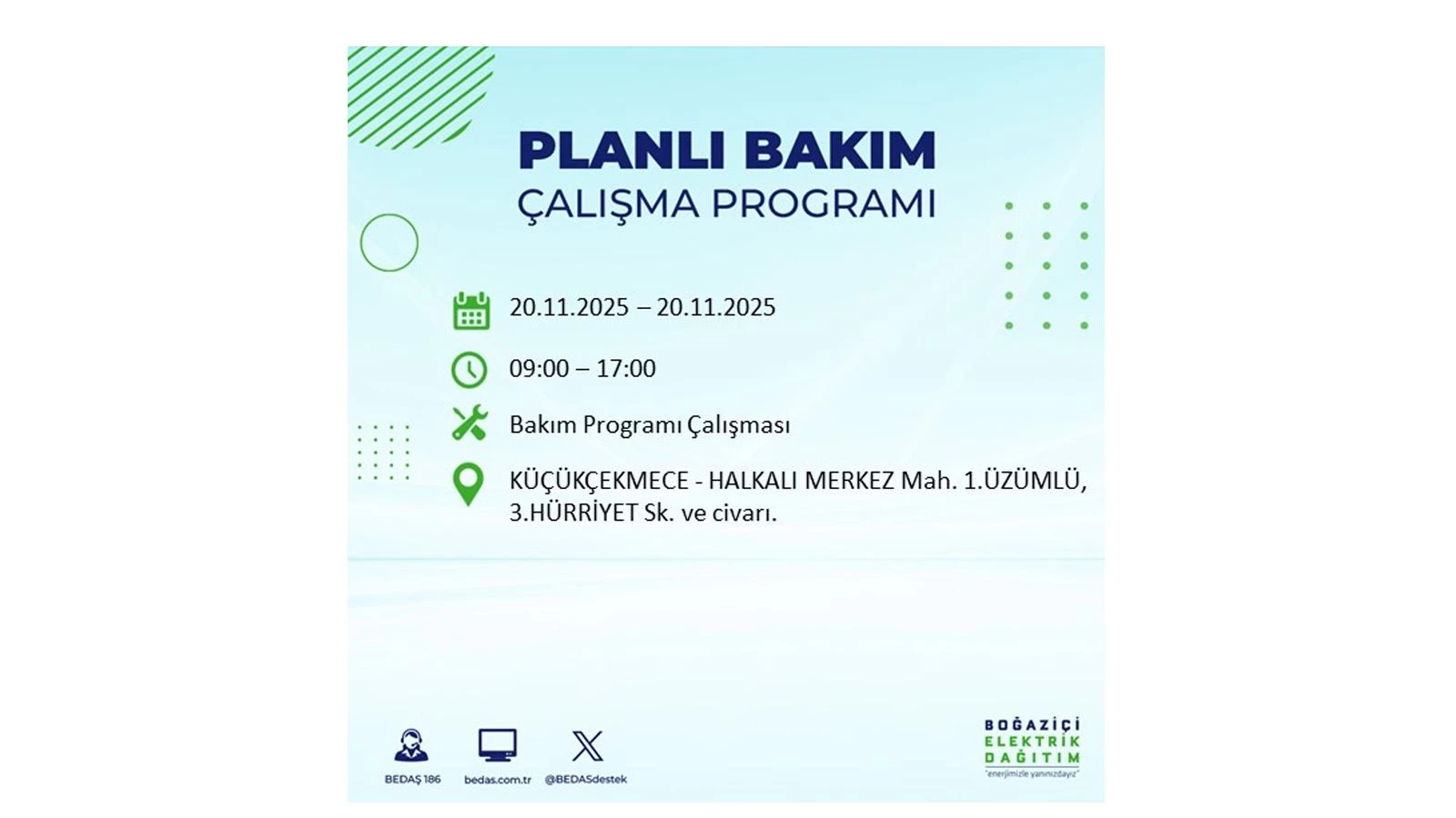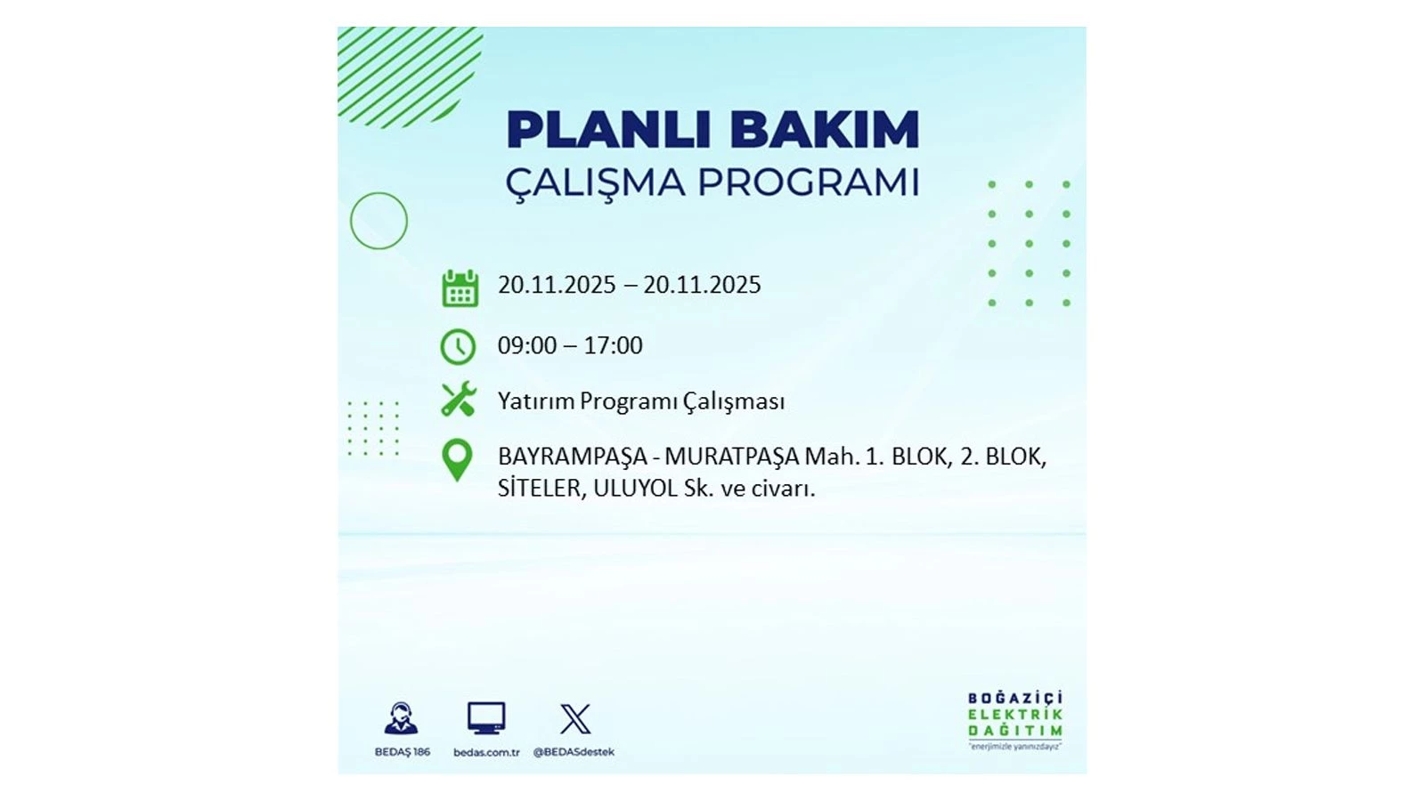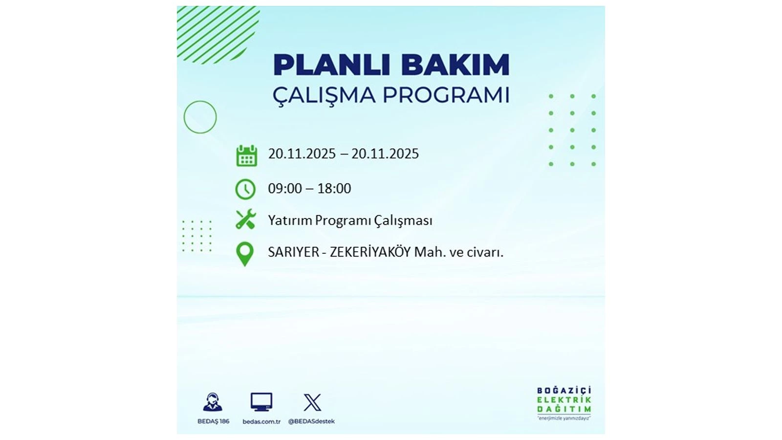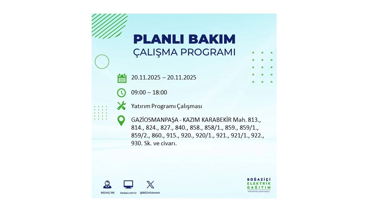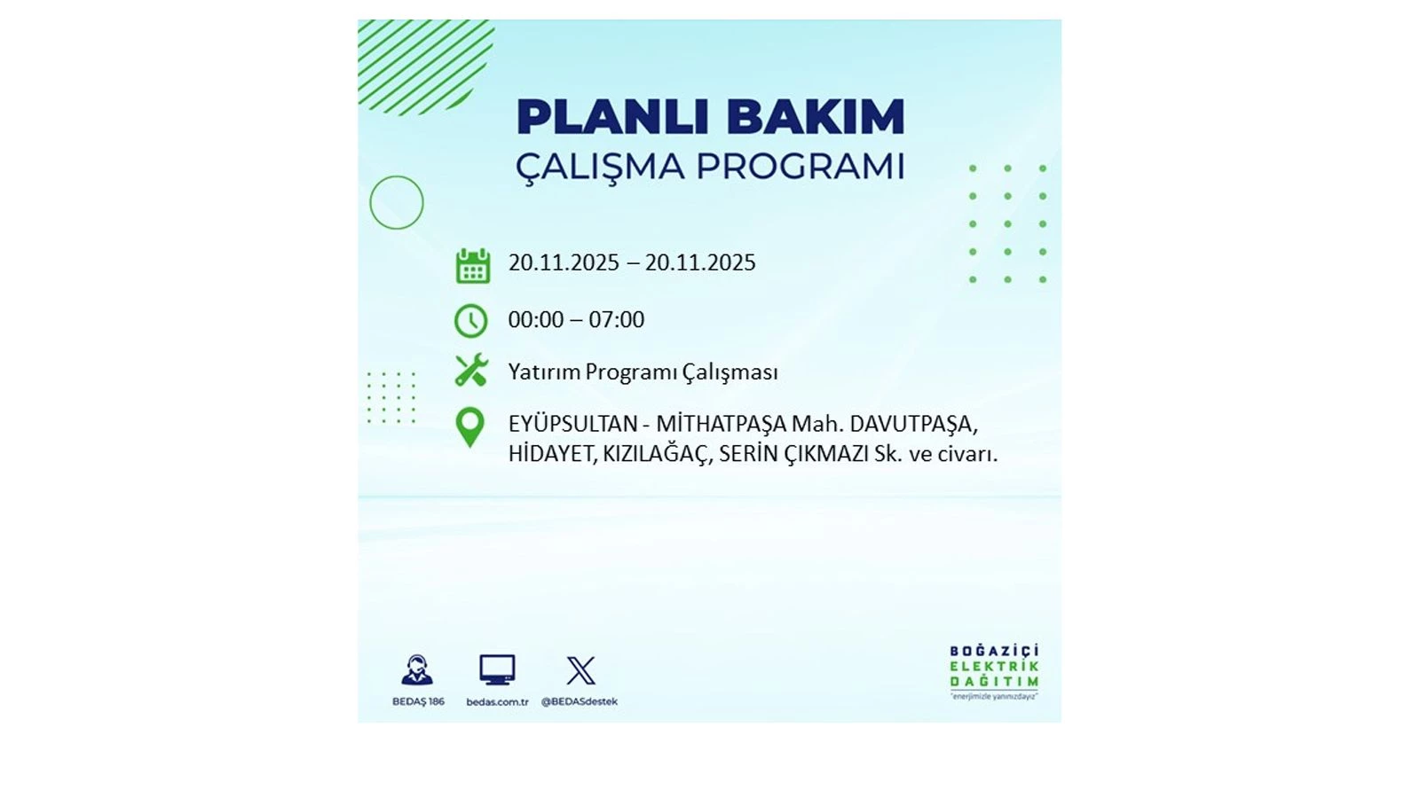Vatandaşlar, “www.bedas.com.tr” adresinde bulunan “Planlı Kesintiler” sekmesinden, cep telefonlarına indirilen mobil uygulama üzerinden ya da 186 BEDAŞ mobil hattını arayarak planlanan elektrik kesintilerine ait güncel bilgilere ulaşabiliyor.