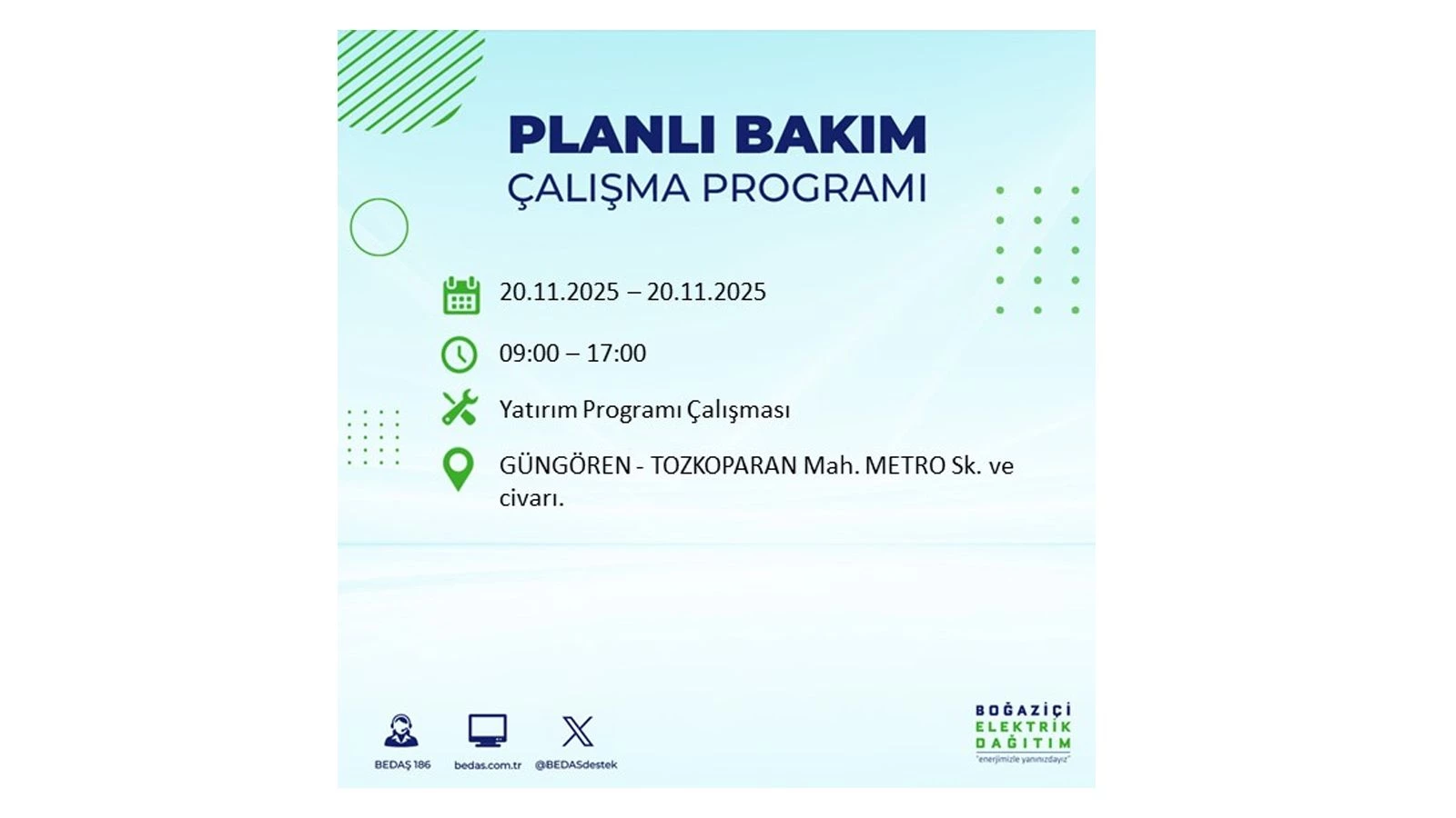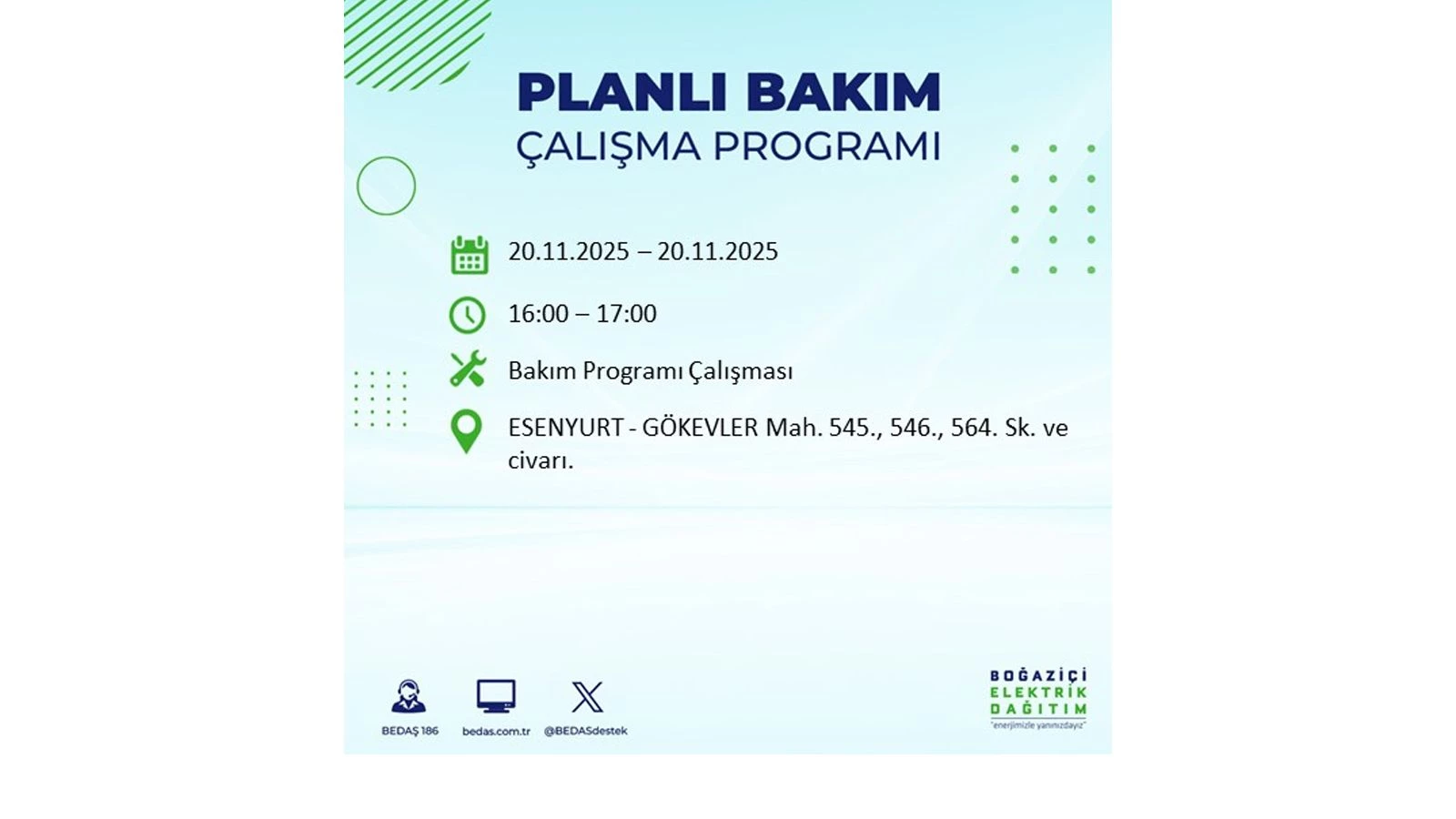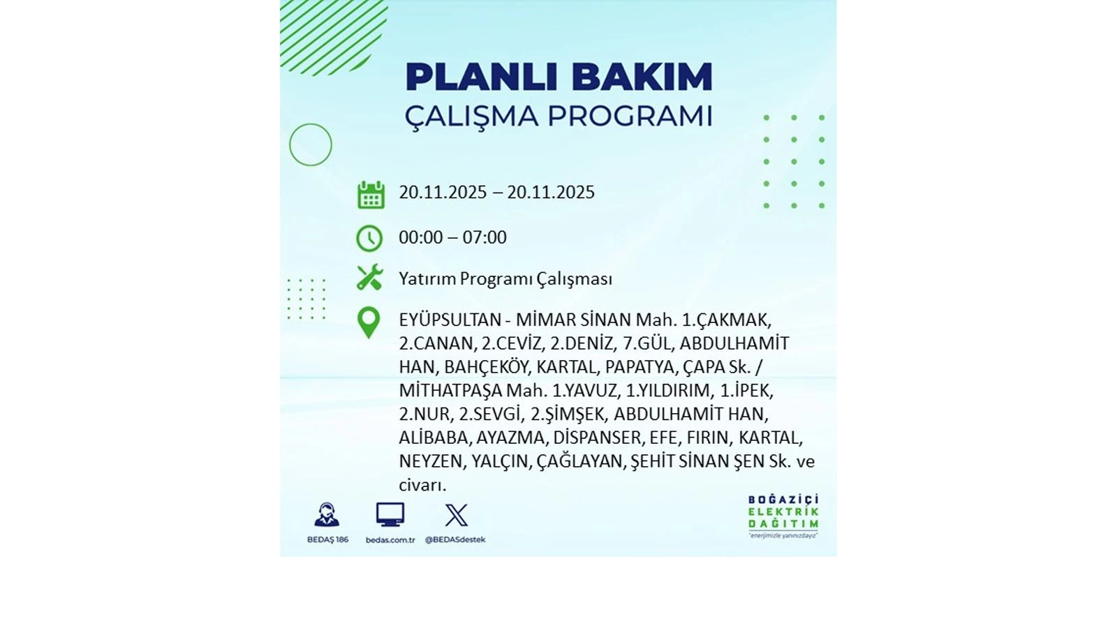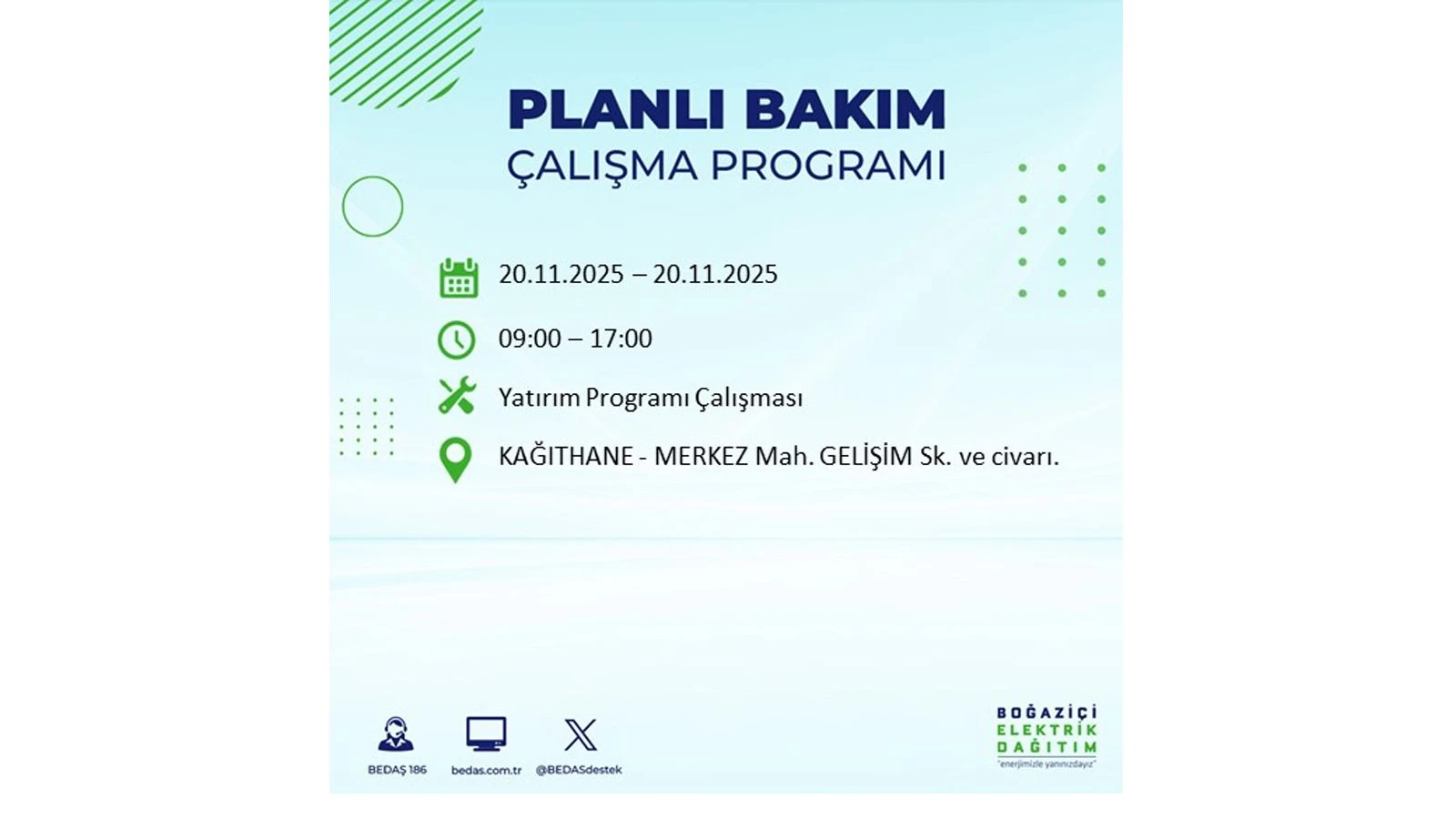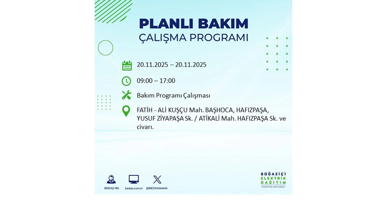 Vatandaşlar, “www.bedas.com.tr” adresinde bulunan “Planlı Kesintiler” sekmesinden, cep telefonlarına indirilen mobil uygulama üzerinden ya da 186 BEDAŞ mobil hattını arayarak planlanan elektrik kesintilerine ait güncel bilgilere ulaşabiliyor.