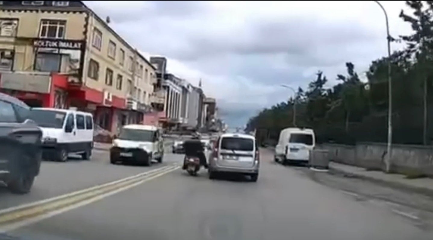 İki sürücü arasında yaşanan kavga, başka bir aracın kamerası tarafından kaydedildi. Görüntülerde taraflar arasındaki tartışma ve motosiklet sürücüsünün kaskla araca saldırdığı anlar yer aldı.