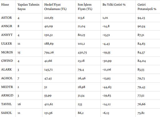 ForInvest Haber’in 30 aracı kurum ve bankanın yayınladıkları araştırma, şirket, strateji raporlarından derlediği gelecek 12 aya ilişkin hedef fiyatlara göre, en yüksek getiri potansiyeli sunan hisse Astor oldu. En az 2 hedef fiyat tahmini alan 82 hisse bu raporda değerlendirmeye alındı.