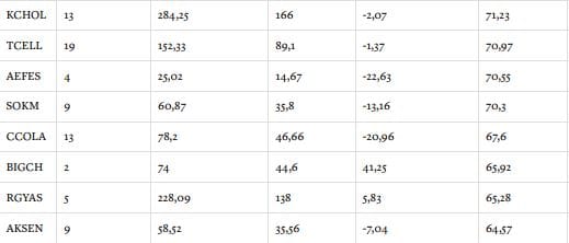 4 farklı aracı kurum ve bankanın hedef fiyat verdiği Astor için 220,65 TL olan hedef fiyat ortalamasına İkinci sırada yüzde 90,54 getiri potansiyeli ile Anadolu Sigorta, üçüncü sırada yüzde 87,31 getiri potansiyeli ile Anadolu Hayat, dördüncü sırada yüzde 84,63 ile Ülker ve beşinci sırada yüzde 84,37 ile Migros yer aldı.